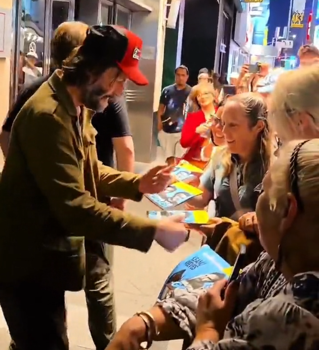 举手投足的细节上也很有意思。基努里维斯不排斥和粉丝互动,他很贴心的停留片刻,给粉丝拍照,而且他还在口袋里放了签字笔,给粉丝手上的宣传册签名。与此同时,他会很小心的和粉丝保持距离,有粉丝努力伸出手来想和他握手,他刻意躲开,并做出拒绝的手势。