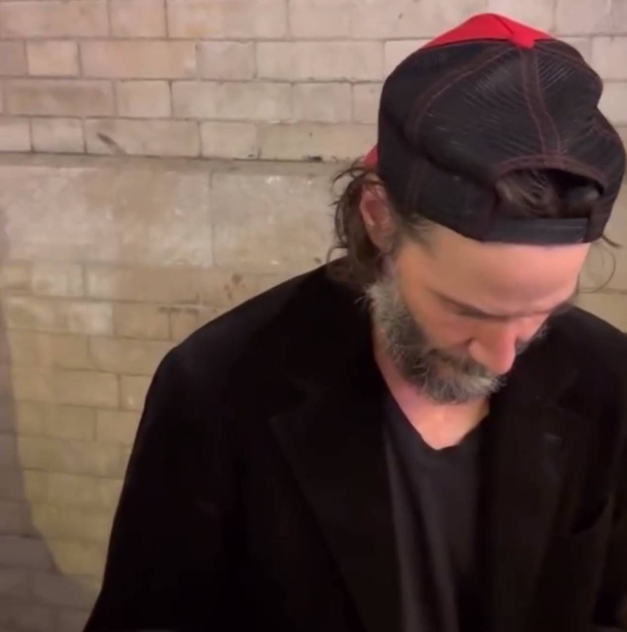 但是迈开步子的基努·里维斯给人的感觉摇摇晃晃,佝偻的像个老头,老到让人不敢认,直到摘下帽子看清长相,才确定是他,凌乱的头发和花白的胡须,和电影里判若两人。