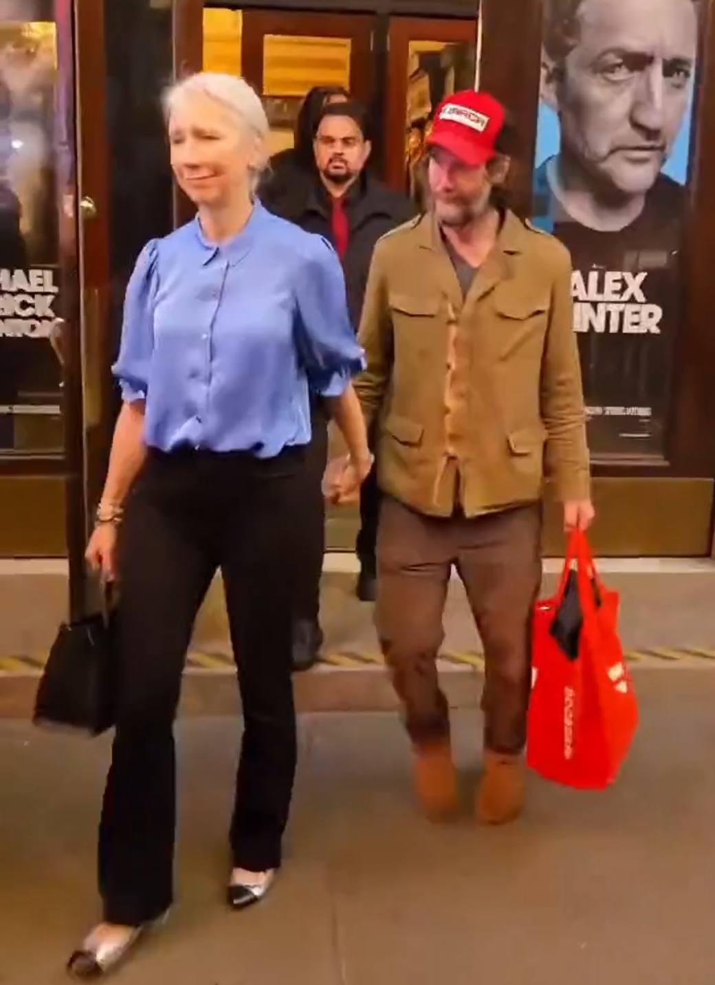基努·里维斯和不确定是女朋友还是已经结婚的Alexandra Grant牵着手走出来,Grant走在前面,她穿着紫色上衣,将衣襟塞进黑色裤子里,身材很好。虽然面容也不年轻,但至少身姿挺拔,活力十足。
