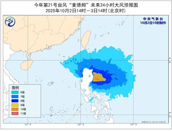 r大风预报:2日14时至3日14时,巴士海峡、南海东北部将有6-7级、阵风8-9级的大风。