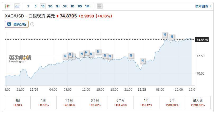 现货白银上涨4.16%,报每盎司74.8705美元,此次一度突破75美元大关。