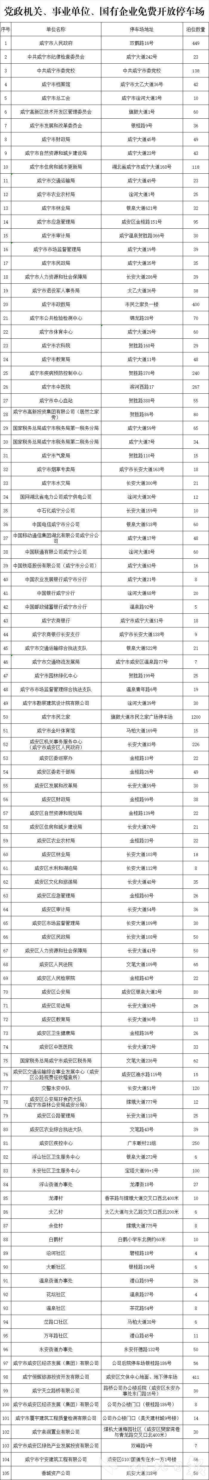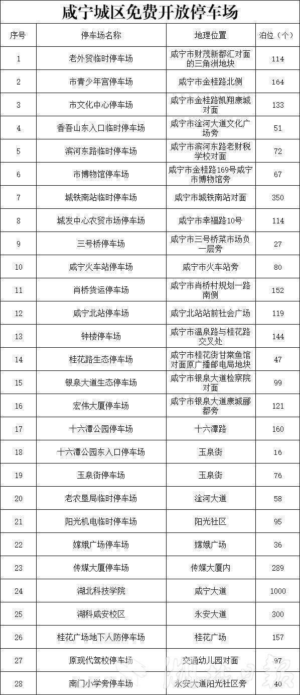 湖北日报讯(记者夏中华、通讯员刘元江)9月30日,咸宁市机关事务服务中心对外发布消息,为有效缓解市民节日出行及来咸游客停车难问题,进一步提升游客的出行体验,该市主城区具备停车条件的党政机关、事业单位、国有企业(含市城发集团开发的停车场所)在国庆中秋期间面向社会免费开放停车。